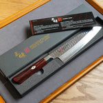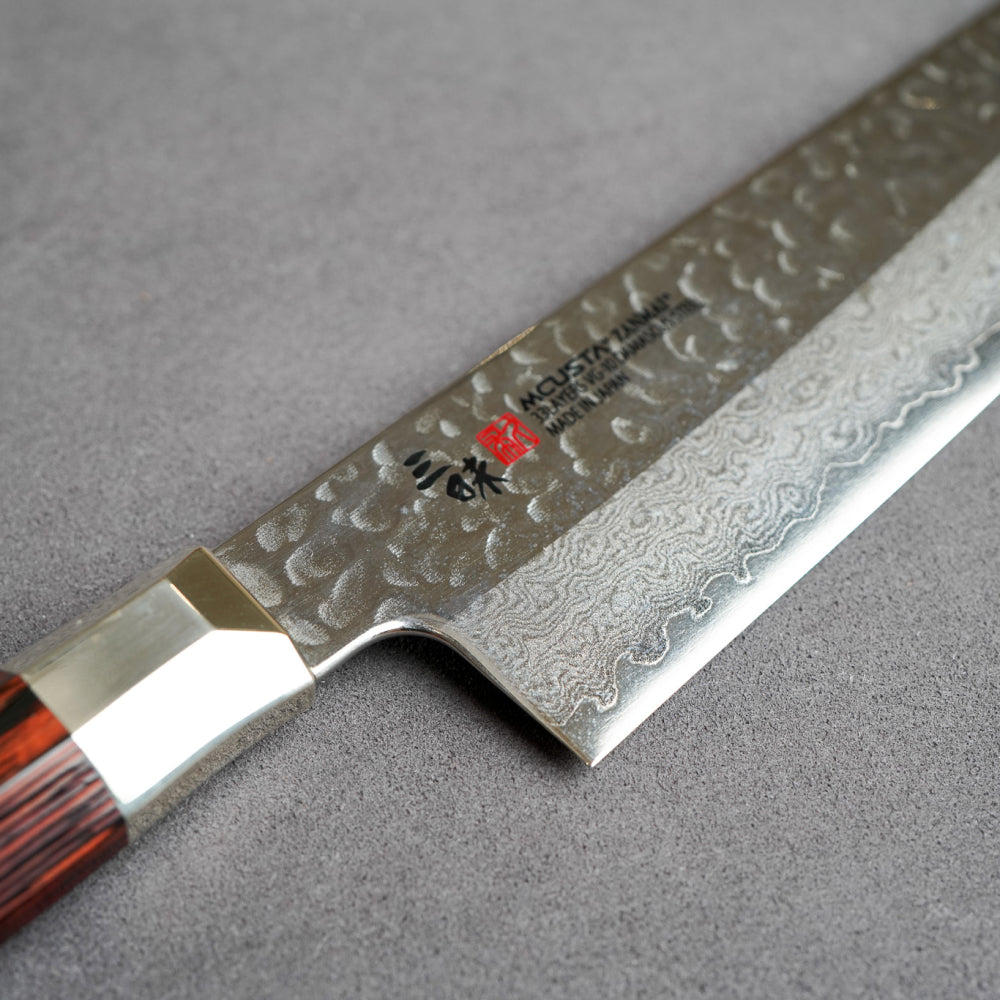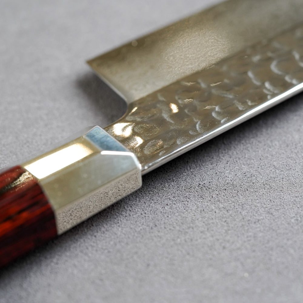 日本三昧Supreme鎚目系列,以VG10不鏽鋼作為芯鋼,防鏽效果佳、易磨。刀身由33層大馬士革鋼製成,並帶有經典的鎚目壓印,富工藝感。八角形和式手柄上鑲有有珍珠母,營造出三昧廚刀的風格。