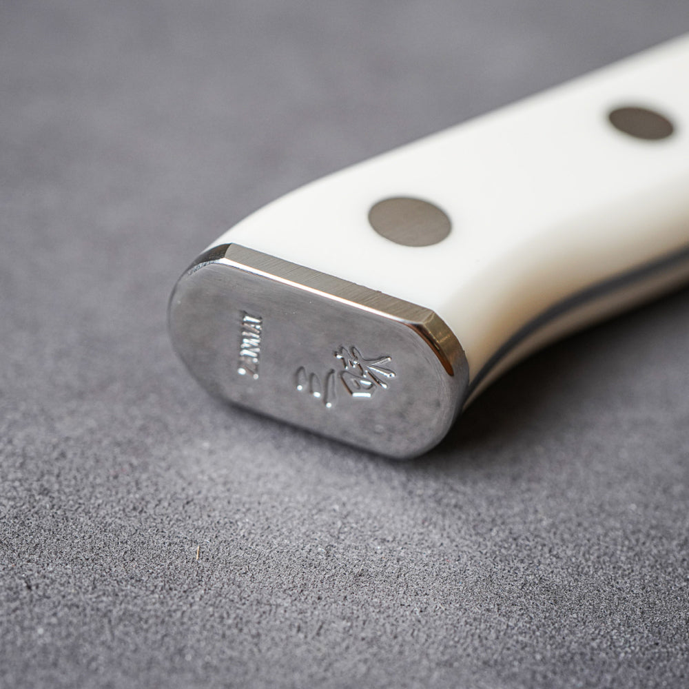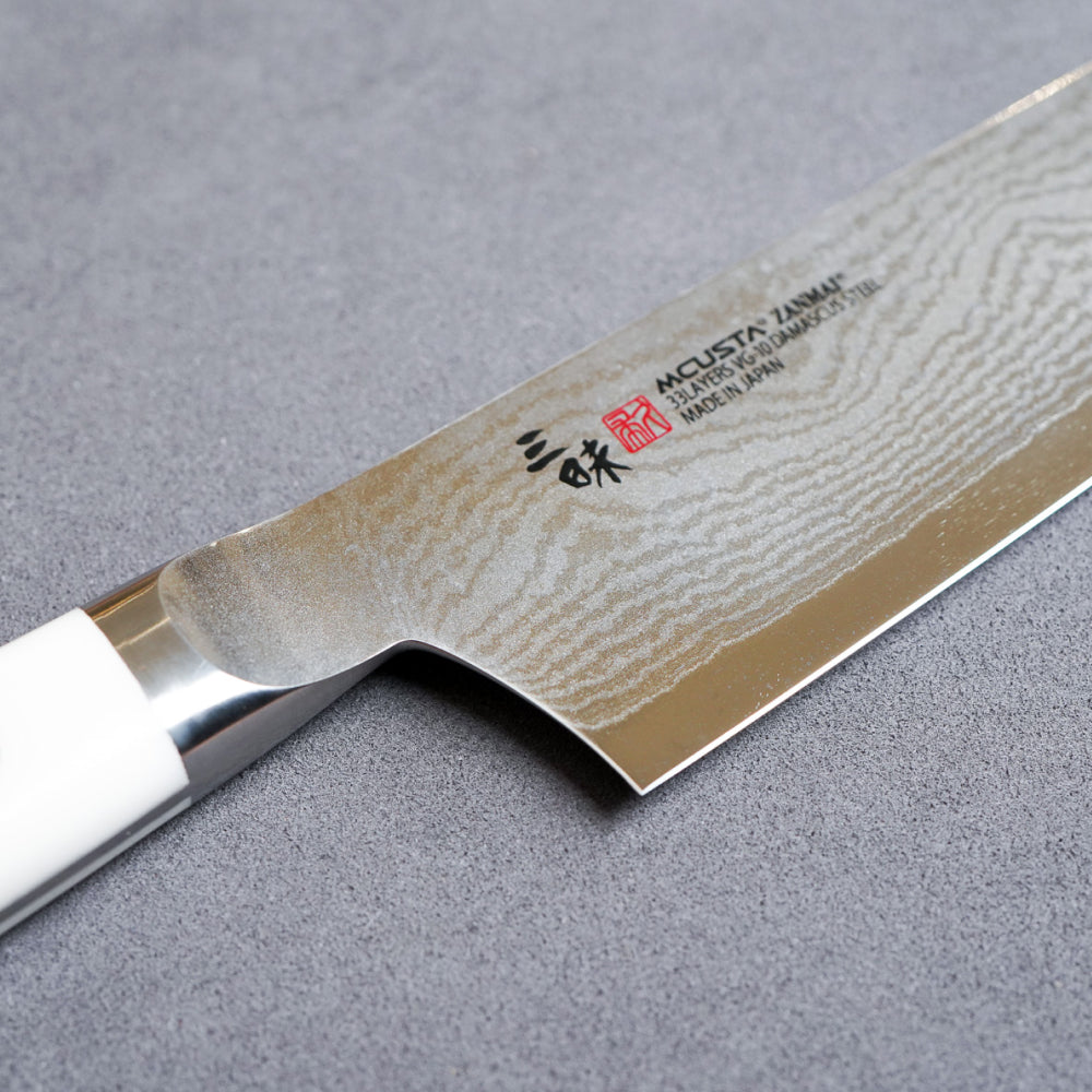 日本三昧廚刀的經典系列,刀柄部分採用特別的白色人造大理石打造。以VG10不鏽鋼作為芯鋼,防鏽效果佳、易磨。刀身由33層大馬士革鋼製成,具有美麗的木紋圖案。