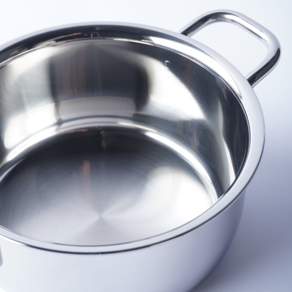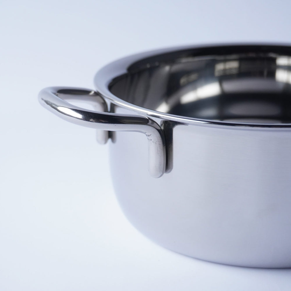 日本宮崎製作所 Geo Product 7層複合不鏽鋼有耳單柄行平鍋,使用7層複合結構:內層為食用級別的304不鏽鋼,中間夾鋁,外層為430不鏽鋼。特有7層複合結構使雪平鍋有效導熱,有效縮短煮食時間。另一特點就是鍋柄直接跟鍋身熔接,鍋身內沒有接口,不易藏污更衞生。鍋身 拋光度十分,光滑的外表使它感覺更高級。鍋蓋與鍋身緊密接觸的結構,加上重量適中的鍋蓋鎖住鍋內水份,可實現無水料理。