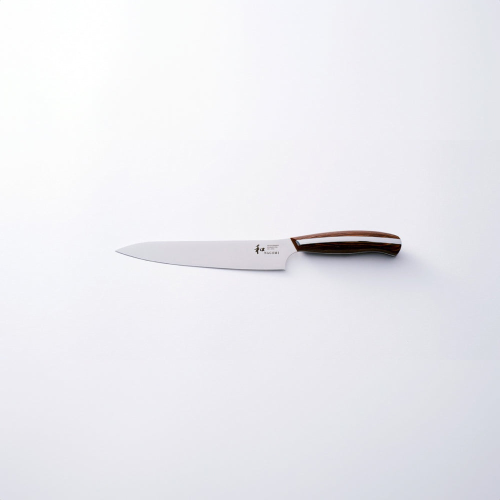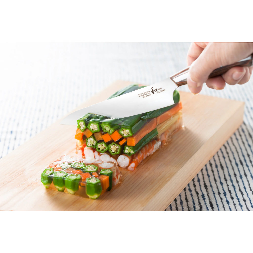 日本【和 NAGOMI】小刀,比普通小刀稍大。當你想快速完成小菜,它也非常方便。由於它輕巧靈活,也很適合剝皮和切割裝飾品等用途。日本【和 NAGOMI】廚刀均由擁有多年經驗的熟練工匠精心手工製作而成,刀身採用440A鉬鋼精鑄打造,防鏽力佳,容易打磨。