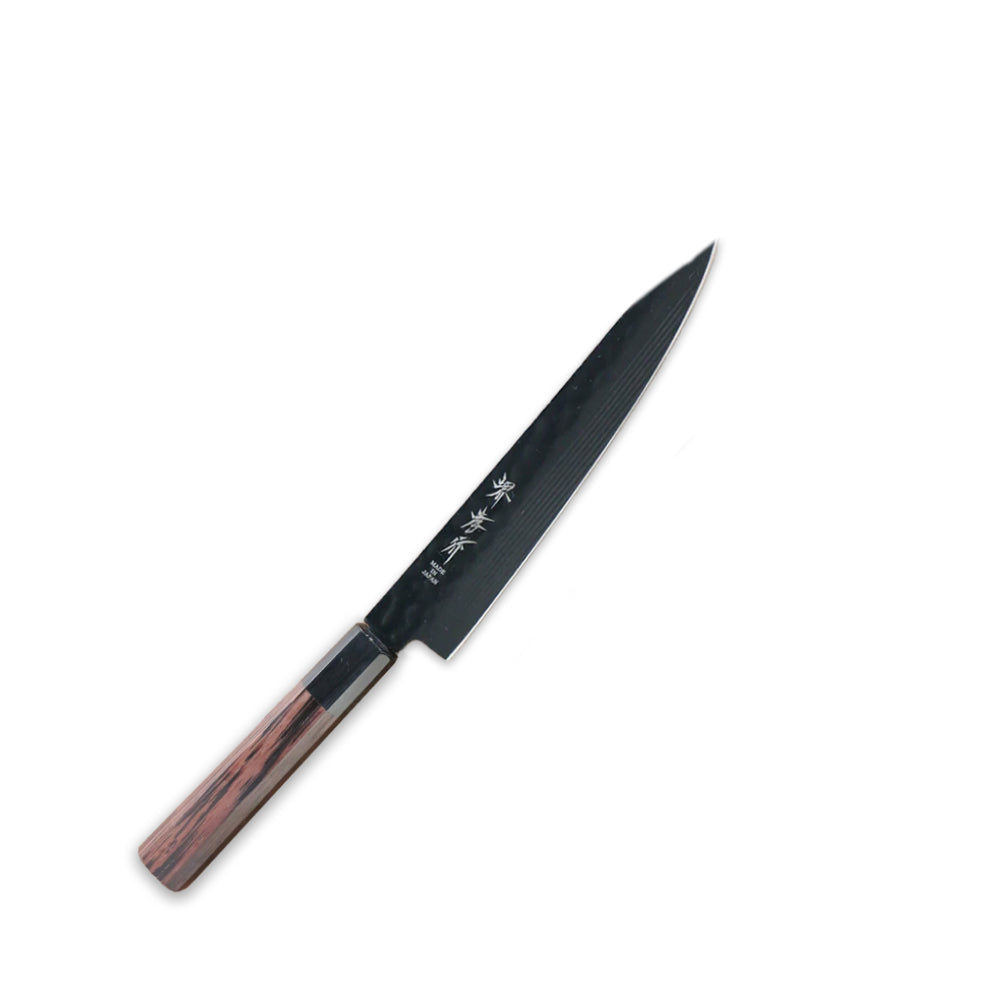 日本堺孝行黑影VG10多用途小刀,以VG10不鏽鋼作為芯鋼,防鏽效果佳、易磨。刀身經鐵氟龍塗層處理,處理食材時可減少沾刀。刀柄部分採用雞翅木,紋理特別。