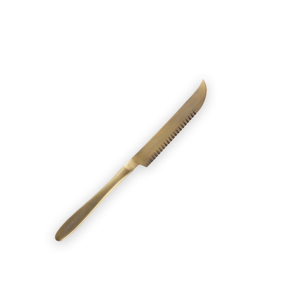 日本志津匠 Pomme 系列 芝士刀,適用於切割軟質至半硬質地的起司。刀尖微微翹起,可當叉子使用,而帶鋸齒的刀刃,也可輕易切開芝士。最面層使用99.9% 24K鍍金,使刀具散發高貴的金光。