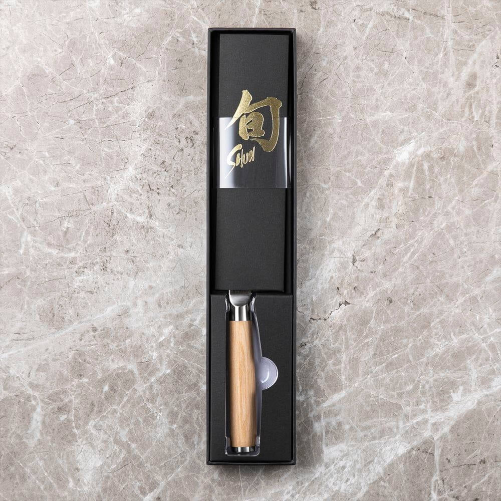 【旬】為日本貝印刀具最高級別的系列。【旬】Classic Blonde系列VG-MAX 33層大馬士革紋削皮刀,以旬獨有的VG-MAX不鏽鋼作為芯鋼,硬度高、耐用、耐酸,不易生鏽。刀刃以極薄雙邊16度開鋒刀刃,切割感佳。手柄採用D型積層強化木設計,貼服防跣,更富握感。