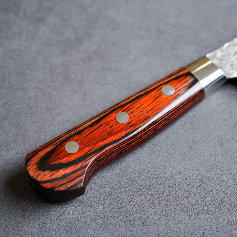 日本堺孝行 VG10 33層槌目大馬士革紋三德廚刀,以VG10不鏽鋼作為芯鋼,防鏽效果佳、易磨。刀身經槌目處理,處理食材時可減少沾刀。刀柄部分採用桃花心合成木,感覺優雅。
